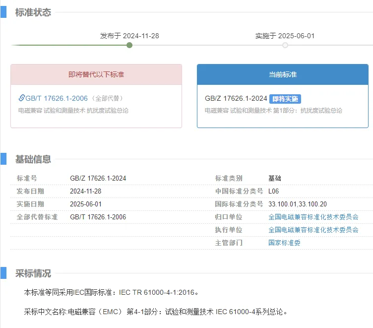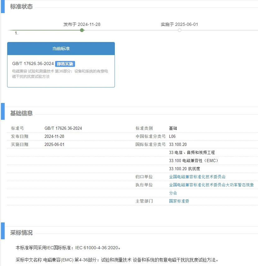 近日,2024 年第 29 号国家标准公告传来重要消息,国家市场监督管理总局(国家标准化管理委员会)批准发布了 290 项推荐性国家标准和 4 项推荐性国家标准修改单,其中 3 项电磁兼容标准备受瞩目,它们将为相关行业带来深远影响。接下来,让我们一起深入了解这三项标准。
