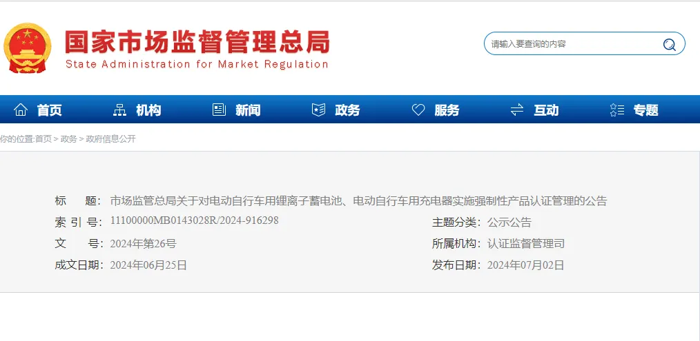 7月2日,国家市场监督管理总局发布2024年第26号公告《关于对电动自行车用锂离子蓄电池、电动自行车用充电器实施强制性产品认证管理》。