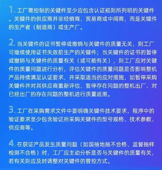 工厂应了解国家质检总局令第117号《强制性产品认证管理规定》、国家质检总局令第63号《认证证书和认证标志管理办法》、国家认监委2001年1号公告《强制性产品认证标志管理办法》规定中关于认证标志和证书的管理要求并遵照执行。