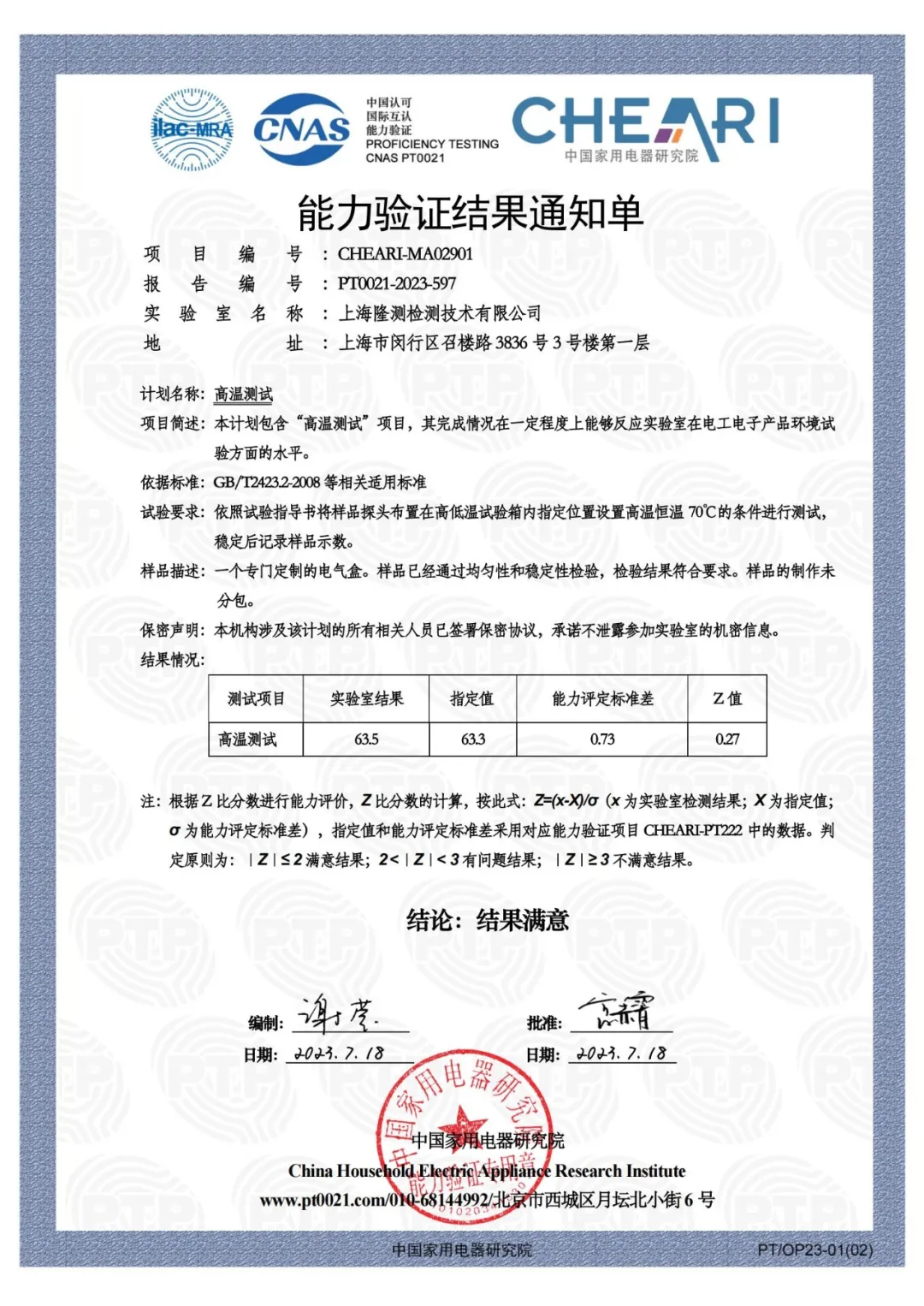上海隆测检测实验室参加中国家用电器研究院验能力验证,并获得满意结果。