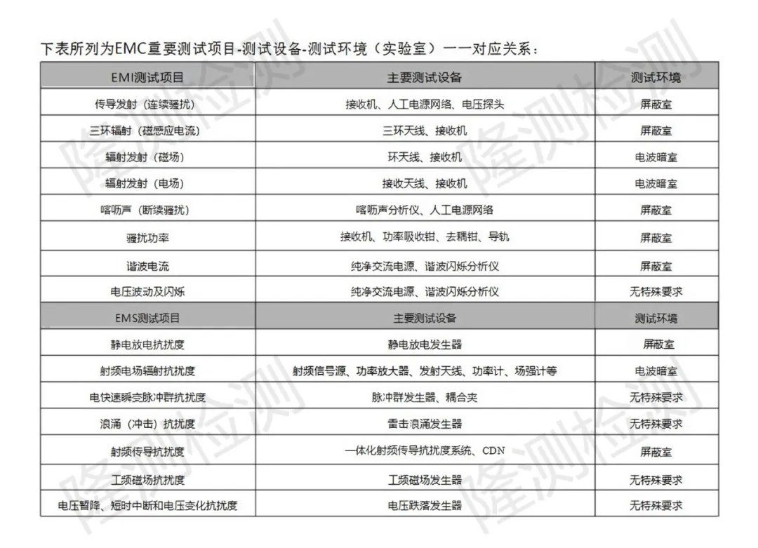 下表所列为EMC重要测试项目-测试设备-测试环境(实验室)一 一对应关系: