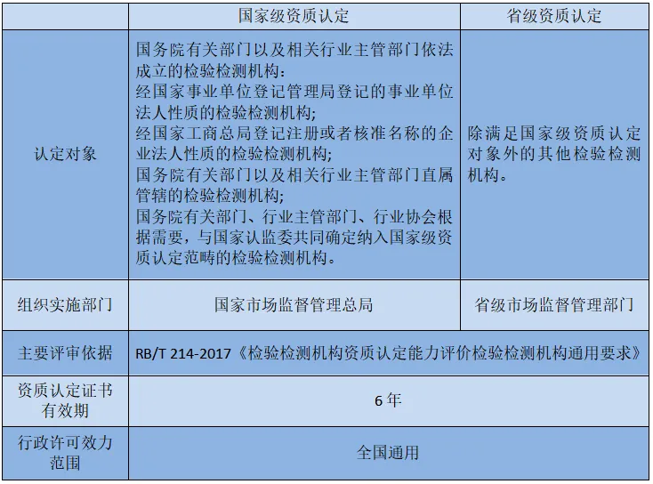 实验室CMA资质认定(计量认证)分为两级实施。一个为国家级,由国家认证认可监督管理委员会组织实施;另一个为省级,由省级质量技术监督局负责组织实施,具体工作由计量认证办公室(计量处)承办。