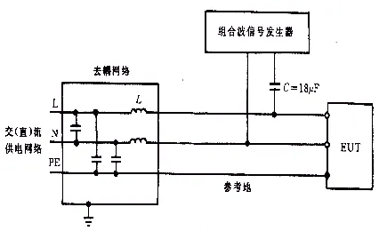 (b)如果干扰源与受试设备的端口在同一线路中,例如在电源网络中(直接耦 合),那么信号发生器在受试设备的端口能够模拟一个低阻抗源;