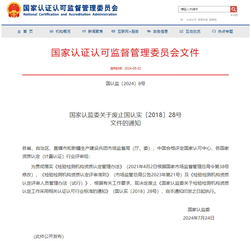 首先,需要明确的是,国认监〔2024〕8号文件废止的是《国家认监委关于检验检测机构资质认定工作采用相关认证认可行业标准的通知》(国认实〔2018〕28号),而非RB/T214-2017标准本身。RB/T214-2017作为《检验检测机构资质认定能力评价 检验检测机构通用要求》的推荐性标准,目前仍然是现行有效的。