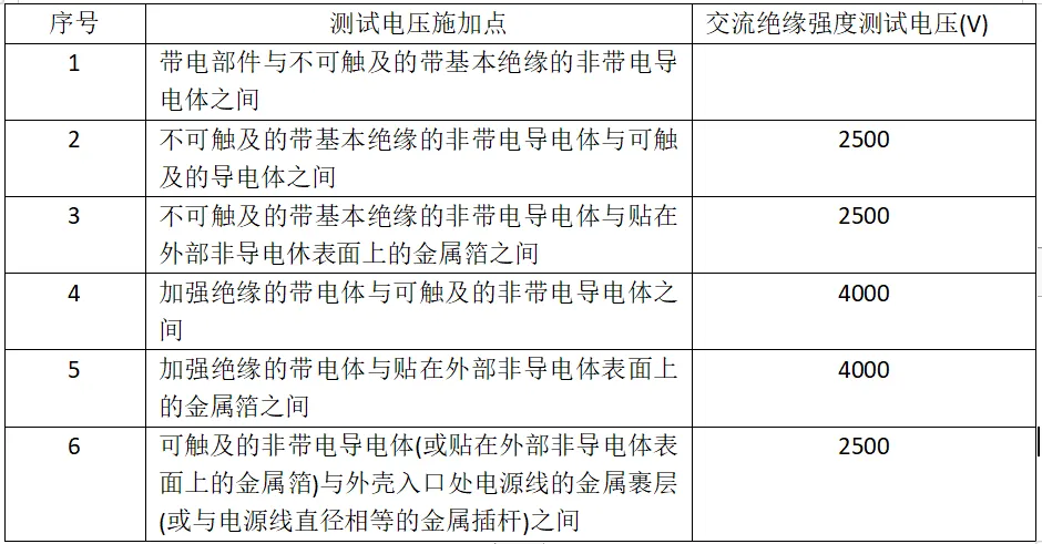 要求:产品的带电部分与可能接地的非带电导电体间须施加适当频率的交流电压达1分钟。具体测试电压如下: