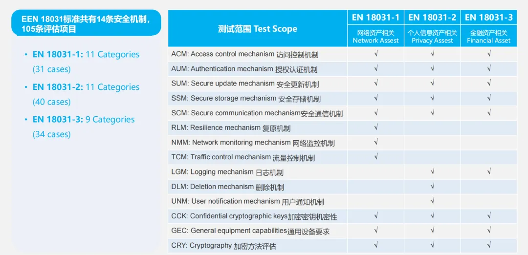 EN 18031系列标准的测试内容如下表所示,要求对这些测试内容进行“概念评估Conceptual assessment”、“功能完整性评估Functional completeness assessment”和“功能充分性评估Functional sufficiency assessment”。