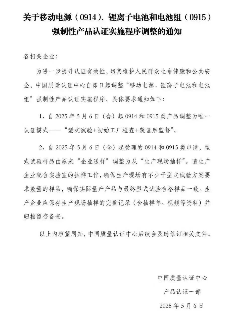 为保障产品质量与消费者安全,2023年3月相关部门将移动电源(0914类 )、锂离子电池和电池组(0915类 )纳入强制性3C认证管控目录,自2024年8月1日起,未获认证不得出厂、销售、进口或用于其他经营活动。