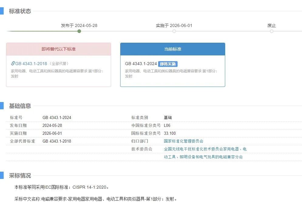 GB 4343.1-2024《家用电器、电动工具和类似器具的电磁兼容要求 第1部分:发射》批准发布