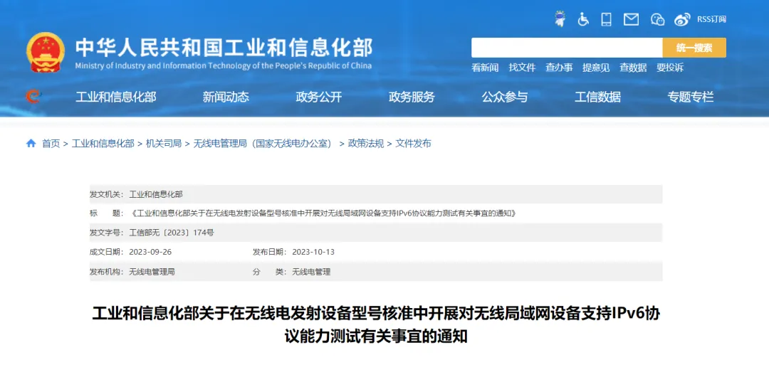 SRRC发布无线局域网设备支持IPv6协议能力技术要求和测试法