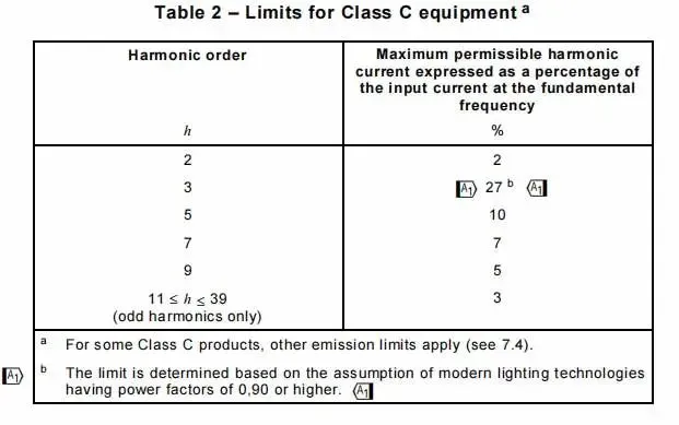 1.针对CLASS C的大于25W的照明产品,仅要求第2次谐波和2-40次的奇次电流谐波不超过要求限值即可满足要求,对于每一次限值是需要进行计算的,限值电流 = 基波频率下输入电流*表2对应的百分比。