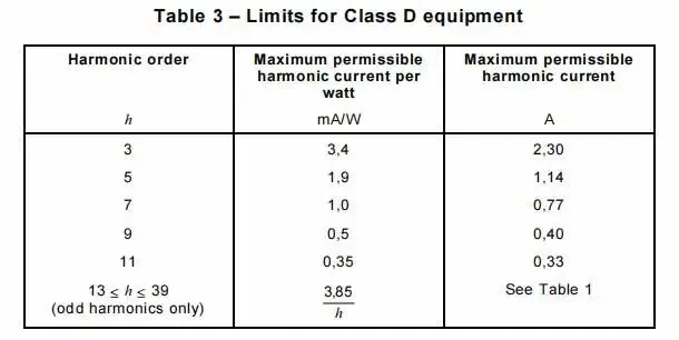 Class D: 功率小于或等于600W的设备,个人电脑及个人电脑显示器;电视接收器;冰箱和冰柜有一个或多个变速驱动器来控制压缩机电动机。