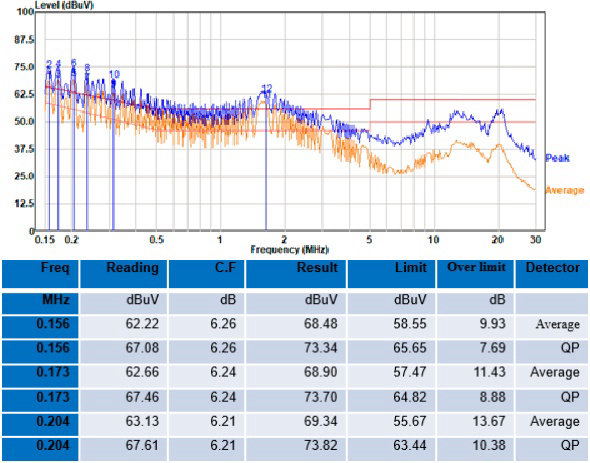 某款医疗产品,传导发射测试不合格,测试曲线如下