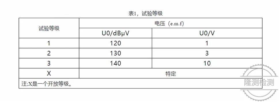 试验等级定义的频率范围为150kHz-80MHz。9kHz-150kHz频率范围内,对来自射频发射机的电磁场所引起的感应骚扰不要求测量。试验等级如表1所示。